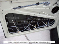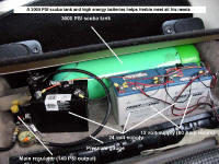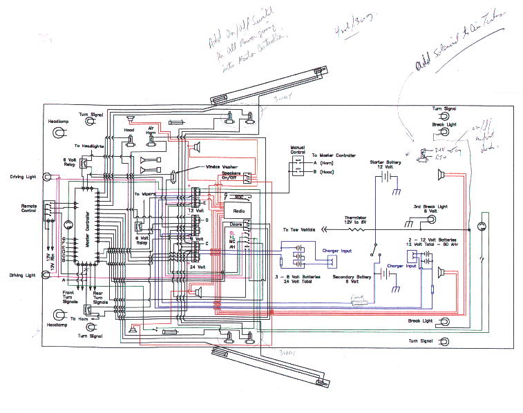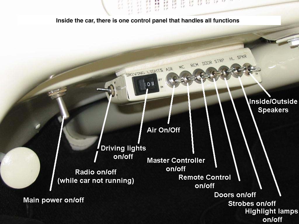 In the beginning, Herbie's central nervous system consisted of several electro-mechanical controllers that formed his brain, a pneumatic system with air cylinders under the hood and in the doors, a remote control unit for external activation, a strobe system, halogen driving lights, and because he still had his original 6 volt electrical system, we added a 12 and 24 volt electrical system to help with some of the other everyday functions. Since then, we have replaced the controllers with a new laptop computer (his new brain) that controls up to 128 servo's simultaneously and have added some extra features such as electronically controlled air shocks on all four wheels, servo driven headlights that can look left and right as well as up and down and visors that blink, oil (water) ejectors on his rear wheel and in the engine compartment, and more.   Overall, he is pretty high tech...