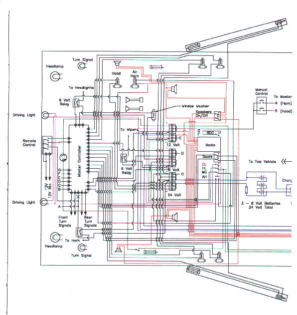 In the beginning, Herbie's central nervous system consisted of several electro-mechanical controllers that formed his brain, a pneumatic system with air cylinders under the hood and in the doors, a remote control unit for external activation, a strobe system, halogen driving lights, and because he still had his original 6 volt electrical system, we added a 12 and 24 volt electrical system to help with some of the other everyday functions. Since then, we have replaced the controllers with a new laptop computer (his new brain) that controls up to 128 servo's simultaneously and have added some extra features such as electronically controlled air shocks on all four wheels, servo driven headlights that can look left and right as well as up and down and visors that blink, oil (water) ejectors on his rear wheel and in the engine compartment, and more.   Overall, he is pretty high tech...